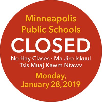 All Minneapolis Public Schools (and District Offices) are closed Monday, Jan. 28 due to heavy snow. We are cancelling school to ensure student safety as transportation delays due to snow-packed streets would be unavoidable.